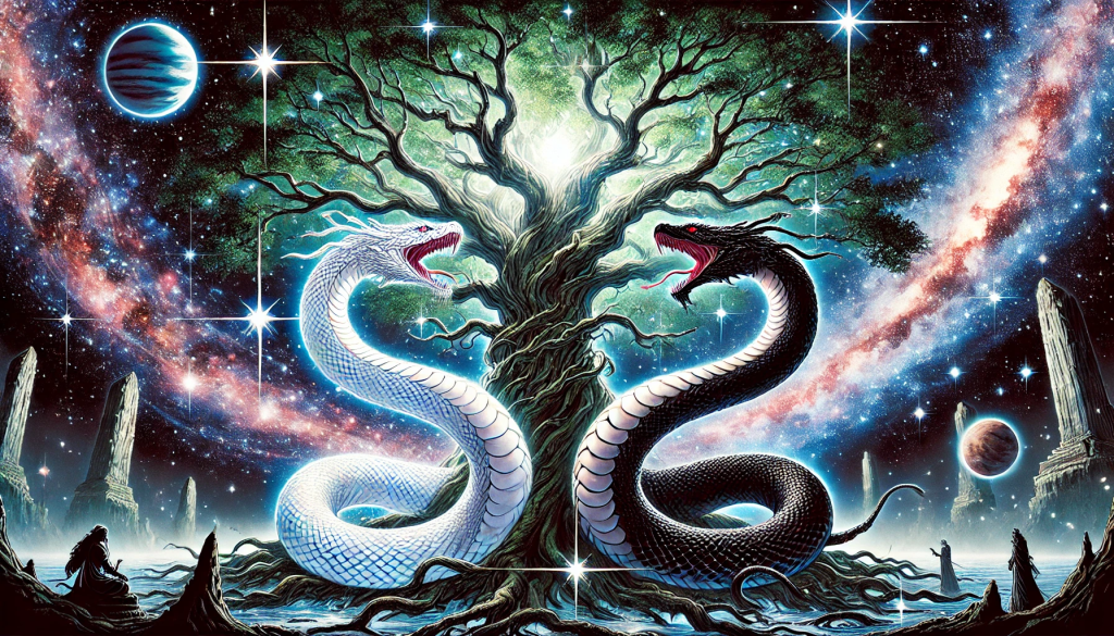Typhon and Tyrissa are not just guardians—they are the embodiment of the universe’s eternal cycle of creation, destruction, and rebirth. Their bond transcends time, and their power is woven into the very fabric of the World Tree itself. The legends of the two serpents will guide the Circle on their journey, as they too must protect the balance and ensure that the forces of shadow do not eclipse the light.